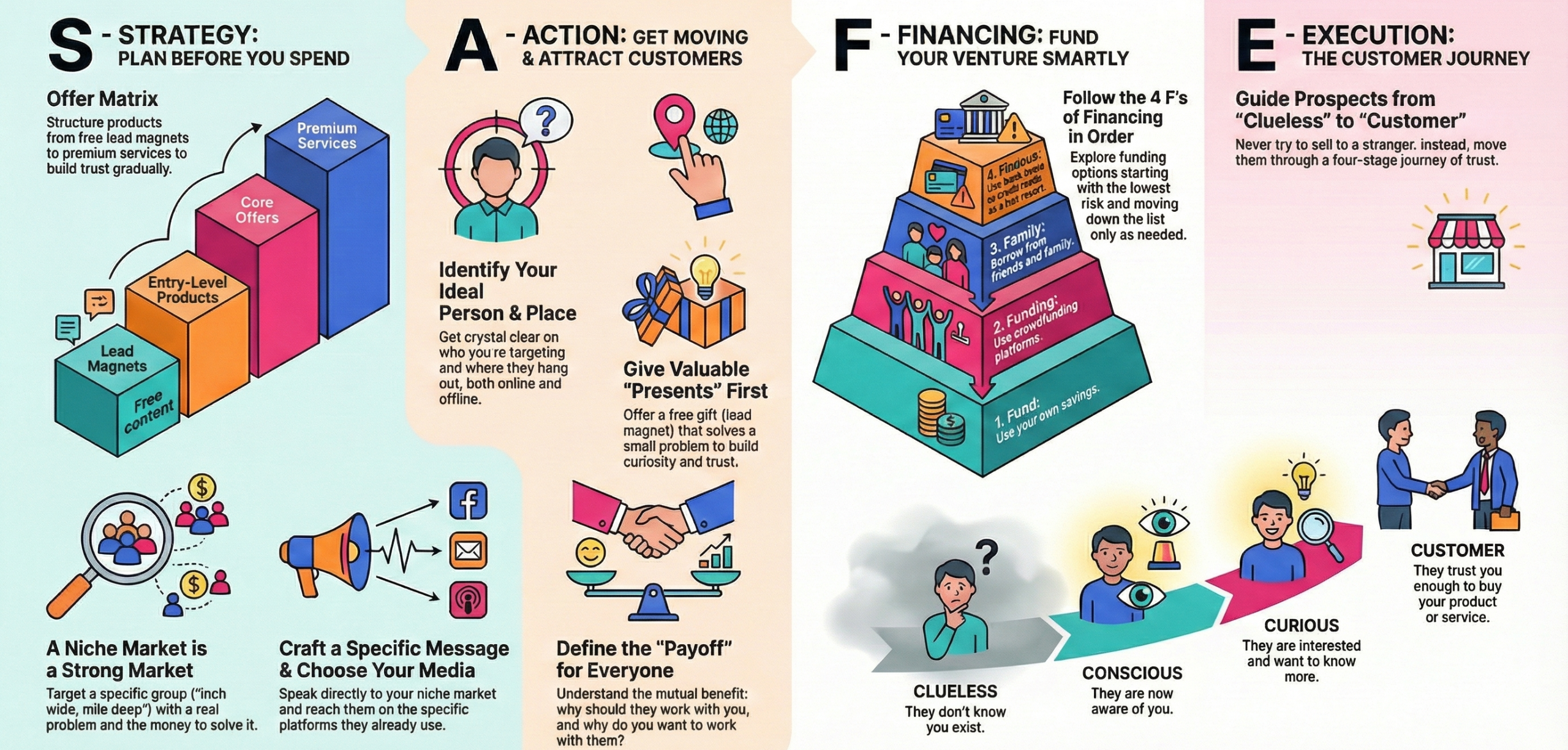 Whether you're completely new to business or you've tried before and struggled, SAFE gives you a clear path—from zero to your first paying customers, and beyond. It focuses on what actually works in the real world, helping you avoid the biggest mistakes most startups make: wasting money, targeting the wrong people, or building something nobody wants.